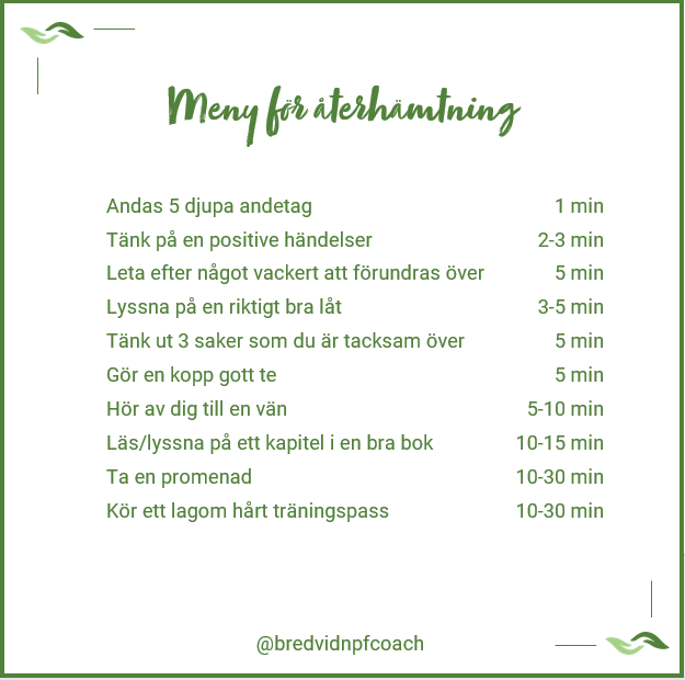 Vad kan finnas på menyn? Här får du några idéer från mig. Välj det som passar dig. Och fyll på med dina egna återhämtande idéer.